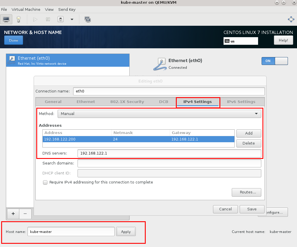 Avem nevoie, după cum am spus, de 3 mașini virtuale cu CentOS 7 minimal. Nu insist asupra instalării lor în KVM, dar trebuie să precizez că fiecare din cele 3 servere trebuie să aibă câte un IP static; pentru asta, în momentul instalării, din panoul de instalare vom merge la Network&Hostname --> Configure; în tabul IPv4 Settings selectăm pe Manual, click pe Add și introducem IP-ul dorit din clasa furnizată de rețeaua virtuală virbr0 a KVM (192.168.122.0/24), având grijă să completăm și valorile pentru Gateway și DNS Server. Tot aici se poate stabili și hostname-ul mașinii respective (dacă nu se setează aici, poate fi stabilit ulterior, cu ajutorul comenzii hostnamectl):