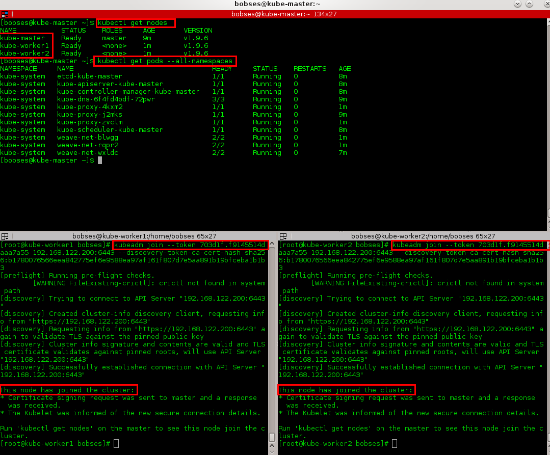 kube-worker2 Ready <none> 1m v1.9.6 [bobses@kube-master ~]$kubectl get pods --all-namespaces