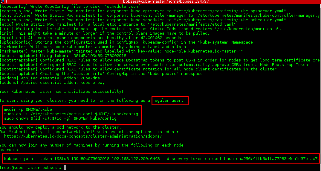 as root:kubeadm join --token f98fd5.199d89c073002918 192.168.122.200:6443 --discovery-token-ca-cert-hash sha256: 4ffb6b1fa77283b4ea1d37bfac7c83 33339b29e6a216a40f41346150aabe 691e
