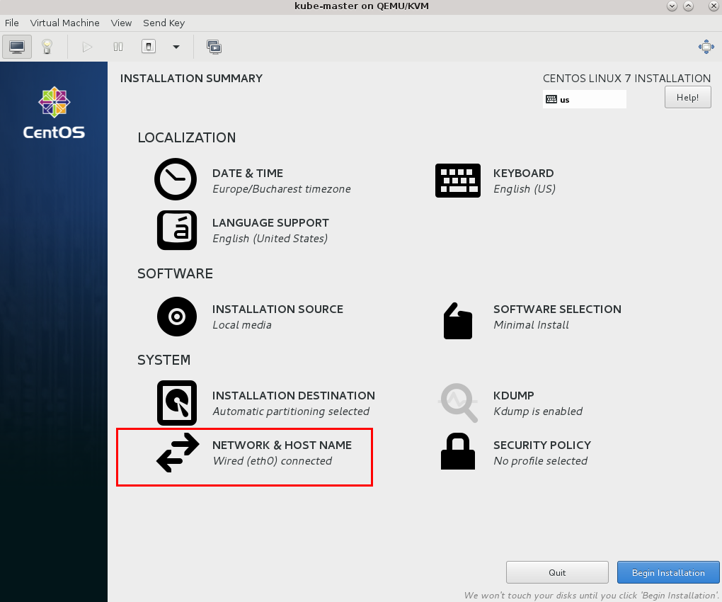 În articol voi prezenta instalarea ultimei versiuni Kubernetes 1.9.6 pe CentOS 7, cu ajutorul utilitarului kubeadm, pe un sistem de virtualizare KVM (nativ Red Hat). Am construit 3 mașini virtuale cu CentOS 7 minimal installation. Un server va fi master, iar celelalte două vor fi nodurile worker.